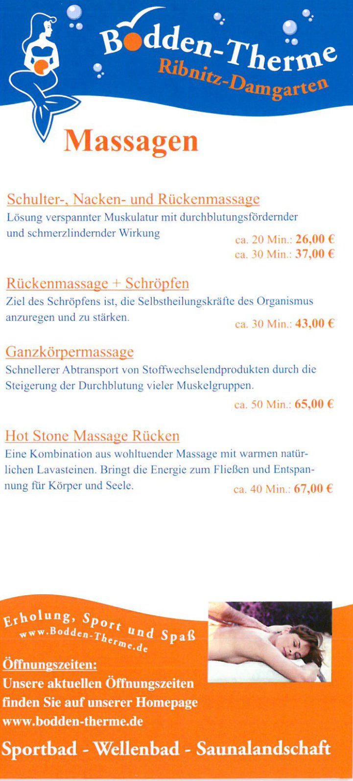 Informationen zu unseren Massagen finden sie im Kassenbereich und oder am Saunatresen